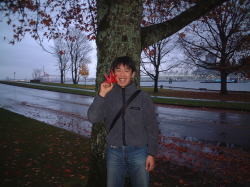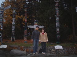 | トーテンポールの前で | 海をバックにメープルを持って | うれしそうなTaka |