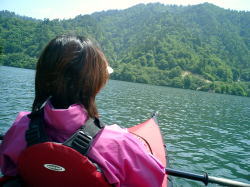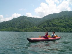 | 朝起きて、すぐに露天風呂へ向う。朝からゆったりと貸切で入る。 ↓ 朝食はまたまた体に優しいお料理。鮎の甘露煮がめちゃくちゃおいしかった。昨日に引き続き、おひつを空っぽにする。 ↓ カヌー体験のガイド、HIDEさんがお迎えに来てくれた。宿の前で女将さんと記念撮影して出発。 ↓ HIDEさんの先導で、奥利根湖へ到着。カヌーの漕ぎ方の説明を受ける。ボイジャー450Tというカヌーに乗り込む。 Shoが前でTakaが後ろ。 ↓ ゆったりと漕ぎ出した。Shoはひっくり返るような気がして、なかなか漕ぎ出せない。Takaが後ろでせっせと舵取りしながら漕ぎ進めていった。 30分くらい漕ぐと出発地点は見えなくなり、目の前に広がる景色は見渡す限りの山々。 カナダのバンフでみたような景色が広がって、天気も良かったので気持ち良かった。Shoもだんだんとカヌーに慣れてきて、せっせと漕ぎ出した。 ↓ ガイドのHIDEさんと色々話をしながら漕いでいるうちに、すっかりカヌーの魅力に取り付かれる。 これなら近くの川や沼で漕げるのではないかと思い始めた。あっという間の半日コースが終了。 次回は一日コースで参加することをHIDEさんに約束して、奥利根湖でお別れ。 ↓ 帰りがけに宝川温泉の大露天風呂に入浴。大露天風呂は混浴な為、Shoはバスタオルを巻いて、Takaと一緒に入っていった。 あたりまえだが、右を見ても左を見ても裸の人々だらけで少々目のやり場に困るSho。 それでも生まれて初めて入る大きな大きな露天風呂に大満足なのであった。 ↓ 帰りの車の中ではカヌーの話で大盛り上がり。ほとんどカヌー購入する方向で検討が始まった。これがわが夫婦がカヌーへはまる第一歩だった。 |
