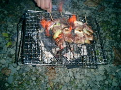 | Gomakichiさんから紹介して頂いた、Yahoo掲示板 カヌートピのオフ会に初めて参加することになった。 11:00頃に今回のキャンプ場「レイクランドヒバラ」で合流。 トピ主のForeさん、Fore.Hさん&クッキー(dog)、Gomakichiさん&Atom(dog)とTaka&Shoの5人と2匹が集合した。 ↓ 受付を済ませて、好きなキャンプサイトにテントを張った。 ↓ 昼食は我が家でアンチョビパスタを作ることになった。 しかし、普通のカセットガスを使用していた為、なかなかお湯が沸かない。 30分以上火にかけたくらいで、ようやく若干沸騰し始めたのでパスタを投入。 かき混ぜながら何とか茹で上がり湯ぎりをしようとしたその時、TakaとShoの息が合わずパスタがこぼれてしまった。 結局、少量ずつしか配分出来なくて、皆さんにご迷惑をかける。次回は火力の強いガスを購入して、慎重に作ろう!! ↓ 食後、桧原湖に漕ぎ出しGomakichiさんにレクチャーを受けながら、カヌーに乗ってワカサギ釣りに挑戦。 Shoは餌の赤ウジが触れない為、Takaに餌付けをしてもらう。 艇が動かないようにForeさんのカナディアンと我が家のTryon2艇を紐で繋げて、ひよこ隊のような状態で釣りを始める。 今日の夕飯に1匹くらい・・・と思っていたが、竿はびくともしない。結局、Foreさんの竿が1回だけ引きがあったが、釣果はゼロでした。 ↓ 寒くなってきたので、陸に戻って全員で焚き火用の薪拾いを開始。皆でせっせと運んで、かなりたくさん集まった。 ↓ 夕飯はForeさんペアが前の晩から仕込んできてくれた、おでんを暖めた。それに鴨肉とネギの串焼きを作ってくれた。 我が家はGomakichiさんがAM中に釣ってきた鱒をダッチオーブンの蓋を使って焼いた。 ↓ ほぼ食事が出揃ったところで、“いただきま〜す”どれもめちゃくちゃ美味しくて食べ過ぎてしまった・・・。 それにしてもFore.hさんのお料理上手ぶりには感動!Shoももっと料理を頑張ろうと思うのであった。 ↓ お腹一杯食べた後、飲み物を持って焚き火を囲んだ。色んな話をして盛り上がり、あっという間に10時過ぎになった。 ↓ ちょっと小腹が空いた頃、Fore.hさんがラーメンを1人分ずつ作ってくれた。手作りの焼き豚がのったラーメンは、まさに絶品。 昔、飲んだ後に屋台で食べたラーメンみたいだった。おいしかった〜。 ↓ 今回このキャンプ場を紹介してくれたczs01707さんの計らいで、キャンプ場のオーナーご夫婦と一緒に、 1時間ほどお酒を飲みながらお喋り。裏磐梯の情報をたくさん教えてもらった。 ↓ 各自テントに戻って就寝。 |