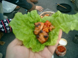 | サンチュにお肉とキムチ、最高! | 豚トロ塩焼き | 黙々と焼肉を食べる |