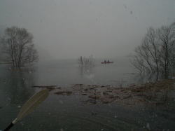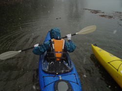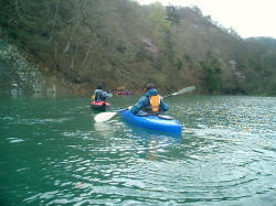 | おっかなびっくり漕ぎ出すSho | 寒そう〜 | 舞っているのは雪か桜か・・・? |