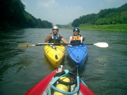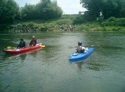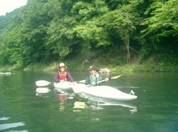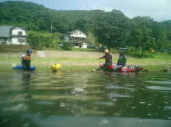 | Takaは5時頃起床してコンビニへ行き、朝食の材料を調達。 Shoはゆっくり寝ようと思っていたが、暑くてテントの中がサウナ状態になってしまったので7:00頃に仕方なく起きる。 少ししてSさん奥様もコンちゃんと共に起床。3人でしばしお茶を飲みながら、ゆったりとした時間を過ごす。 ↓ 朝食は我が家で担当して、トマトベースのパスタと目玉焼きとボイルしたウィンナーを作った。 食後にKさんが梨を差し入れてくれた。ついでに“モービルクール”の値段を調べてきてくれた。 \49,000前後。う〜ん、なかなか思い切れない値段だ。 Kさんはお友達とカヌーをするらしく、今日は帰っていった。 ↓ 前夜の雨で多少水かさも増し水も濁っていたが、SさんのOKが出たので、今日も4人で下る事にした。 今日は舟戸やな〜大瀬までのロングコース。先にSさんとTakaが大瀬まで搬送用に車を置きに行った。 S家は2人艇のリンクスで、我が家は各自トライオンで出発。前日よりもお天気が良くて、なかなかの流れ具合。 鮎釣り師もそこそこいたが、トラブルも無くすんなり下っていった。 ↓ 途中、ほとんど車の乗り入れが出来ないような場所では、見事な大自然が広がっていた。 車で数時間のところにこんな素敵な場所があることに感動した。 大自然ゾーンを抜けて少し行くと左側にカヌーショップの看板があった。 Sさんが以前から気になっていた場所だということで、上陸してお店へ向かってみた。 がっ、店からは何の応答も無く、隣の民家の人と話したところ、親戚がインターネットで人を集めてやっているようだとのこと。 あまり興味も無いような様子で、一同がっかり・・・。 ↓ 気を取り直して最後の下りを楽しみ、ゴール地点の大瀬へ到着。 Sさんの話だと、いつもは3〜4時間程度はかかる距離だそうだが、水量が増えていた事などもあり、2時間弱くらいで下れてしまった。 一度、釣り師を気にしなくて良い時期にまた下ってみたい。 ↓ 帰りに「烏山町営 やまびこの湯」に立寄って帰った。2日間天気も良くて最高に楽しかった。Sさん、どうもありがとうございました。 |