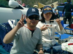 | 4月16日-17日の2日間で、アウトドアショップ「ぱどる」主催の試乗会が開催された。 お店には年に数回訪れているTaka&Sho。 今回は、Yahooトピの皆さんとの交流会も兼ねて、我が家も参加することにした。 4/17(日)朝6:00起床。7時過ぎにTaka&Sho&ゴエモンで自宅を出発。 天気は快晴で、ぽかぽか陽気。半袖でも良いくらいだった。 長距離ドライブに不慣れなゴエモンは、乗って早々に車酔いに襲われ辛そうだった。 ↓ 約2時間くらいかけて、9:00過ぎに玉淀のかわせみ広場に到着。 前夜からのお泊り組Foreさんペア+クッキーとZenさん、今朝から参加のGomaご夫妻+アトム、S御主人と合流。 到着早々、喉が乾いたので早速ビールと酎杯に手を出してしまったのであった・・・。(^_^;) ゴエモンはさっきまでの車酔いが嘘のように、元気に走り回っていた。 ↓ 近くでフリーマーケットをしている人がいたらしく、Foreさんが購入品を色々見せてくれた。 かなり激安でのお買い物だったので、我が家も羨ましくなり皆でフリマを覗いてみることにする。 ↓ 新品の白いヘルメットがあったので、早速Gomaさんが試着。 まるで、Gomaさんの頭に合わせて作ったかのような、ぴったりサイズ。皆に絶賛されて、迷わずご購入に至ったのであった。 我が家は女性用の“半袖パドリングジャケット\2,500”、“ビルジポンプ\500”、“パドル\500”を購入した。 ↓ 10:00にぱどるの試乗会場がオープンした。早速、受付へ行ってみる。 すると、またまた誘惑セール。ライフジャケットが\4,000で販売されていた。 Foreさんペアと我が家は迷わず購入ということで、4人お揃いでお買い上げとなった。 買い物を済ませて、早速Takaの試乗申込みも完了! ↓ 川の方へ行ってみると、まずはForeさんがスターンズの試乗。 気持ち良さそうに笑顔で漕いでいったが、風があるとちょっと漕ぐのが大変そうだった。 でも、クッキーを乗せることを考えると、スターンズの方がいいのかなぁと思ったり・・・(迷) Takaは憧れのポリ艇に乗ろうとするが、空いている艇で体の合うのを探すのが大変。 ようやく1艇空いたので、とりあえず少しだけ乗ってみた。 ↓ お腹が空いてきたので、キャンプサイトに戻って昼食の準備。 昼食はGoriさんfamily、saintさん、キュリさんfamily、ゴステロさんfamily、サタズさん、kikiさんとも合流。 賑やかな大昼食会の始まり始まり〜! ↓ 我が家は購入したばかりの“炉ばた大将”を使用して、焼き鳥を焼いた。 前日の仕込みはShoがやっておいたので、焼き方のTakaが炉ばた先輩のS御主人の指導を受けながら焼いた。 まずまずのお味だったので、これから2人でフラッとカヌーする時はこれにしよう! ↓ “かつおのタタキ”、“かしら肉の串焼き”、“スモークチーズ”、“お好み焼き”、“海鮮串焼き”、“ローストビーフ”、“タンドリーチキン”、 “あんこ餅”、“米だんごの甘辛醤油味?”、“手羽元の蒸し焼き”“焼き鳥”などなどたくさんのお料理が並んだ。 ↓ 我が家も色々と頂こうとshoが2人分のお皿とお箸を用意した。がっ、いざ食べようとしたら、Takaの箸が無い! Taka「俺の箸は〜?」Sho「えっ、さっき出しといたのに、無いの〜」 と、その時。Takaの横で満面の笑みでお好み焼きを食べる女性が1人。手元を見るとそれは紛れも無くTakaのお箸だった。 Taka&sho大爆笑。実はForeさん、先週もまったく同じことをやっていたのだった。2度あることは、3度ある・・・気をつけよう! ↓ 青空の下でこんなに大勢の人達と一緒に食事をするのは我が家にとっては初めての体験。最高に贅沢な昼食会でした。 ↓ 午後からはTakaは色々な艇を試乗した。乗ったら、当然のように“欲しい欲しい病”にかかってしまった。 ForeさんはZenさんの艇や、Goriさんの艇を借りて乗っているうちに、当初は嫌がっていたスリッパのような形の艇をすっかり気に入ってしまった。 Takaは欲しいながらも我慢していたが、Foreさんの“欲しい欲しい病”はやはり一枚も二枚も上手だった。 Goriさんに勢いのある交渉をし続け、結局Goriさんのカヌーを譲り受けることになったのである。 艇を手放す寂しげなGoriさんをよそに、新艇を手に入れて大はしゃぎのトピ主Fore様であった・・・。 今回はYahooトピ「買いましたカヌー」「トッピック一番乗り、カヌーも乗る?」「カヌーを楽しく」の3トピの皆様と交流できて、本当に楽しかった。 また、こんなに色々な種類のカヌーを見ることができるのも、すごく楽しい経験だった。フリマでも色々買ったし、大満足! 初めてお会いした皆様、本当にどうもありがとうございました。これからも宜しくお願いしま〜す! |
