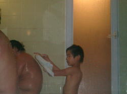 | 男性陣の入浴タイム | 怪しげな浴槽の朝鮮人参&梅 | お父さんの背中を流すDaiki君 |