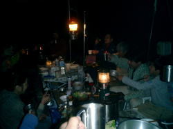 | <前夜> 5/2 PM:10:00頃、自宅出発。 ↓ AM0:00頃、御岳の柚木に到着! 深夜の到着だったので皆さん既に就寝かと思いきや、テーブルを囲んで宴の真っ最中! 前泊組みは、Yan様&Eriちゃん、Hiroさん&Daiki君、T田さん、Senoさん、T代さん&T橋さん。 皆さんと1時間半ほど飲んで、PM2:00頃就寝 <1日目> AM7:00頃、起床。澄んだ空気と、川の音を聴きながら爽やかにお目覚め。 ぞろぞろと起き出して、Hiroさんが中心になって朝ご飯の支度に取り掛かった。 朝食のメニューは、炊きたてご飯,お味噌汁,魚のみりん干し,のり,卵焼き,明太子,などなど。 キャンプとは思えない贅沢な朝食を、しっかりと美味しく頂きました。 ↓ AM中は瀞場でのんびり練習。色んな艇を交換しながら漕いで楽しく過ごした。 我が家もカナディアンやトリックスターを借りてのんびり楽しんだ。 ↓ 11:00過ぎ頃に、Horiさんとせっちゃんが到着。 ↓ お昼頃に一旦休憩して、おにぎり、パン、カップ麺などで昼食を取る。 ↓ 午後からはHoriさんに、レスキュー講習を受けることになった。 まずは口頭での説明。川下りをする際の色々な合図や、ロープの使い方等を説明して頂きました。 がっ、しかし・・・。強烈な睡魔に襲われて、話を聞きながらT田さんとShoは所々爆睡してしまいました。 (Horiさん、ごめんなさい(>_<)頂いた合図の出し方の資料は、熟読して勉強しておきます!) ↓ 次に実際に体験しながらの講習が行われました。 1.川の横断方法 @1人で横断する方法(シングルパドルを使用) 上流側に体を向けて、パドルを逆さまにし、脇にかかえてしっかりと持つ。 体の重心をしっかり落として、パドルで深さを確認し一歩ずつ踏み込んで横に移動する。 A複数人で横断する方法(2列) 上流に向かって2列に並び、前の人のライフジャケット肩部分を持って、重心を落として一歩ずつ踏み込んで横に移動する。 B複数人で横断する方法(三角形を作る) 上流に向かって前から3人→2人→1人というふうに三角形を作って、重心を落として一歩ずつ踏み込んで横に移動する。 ※子供や女性等、力の弱い人をなるべく後列にすることで、水流の勢いを減少させることができる。 2.沈して流された場合、エディに入る訓練 流されたという想定で、体験。両足を上げて、本流からエディへ抜けて行くのが意外と難しかった。 3.水深が深いところで、ロープを使って対岸へ渡る訓練 対岸にいる人にレスキューロープを投げて、両岸でロープをしっかりと固定。ロープをつたいながら対岸へ移動。 ロープを張る角度を間違えると渡るのが難しいので、流れを良く考えてロープを固定することが必要。 場合に寄っては、ロープを緩やかに持つ必要もある。 4.レスキューロープを使用しての救助訓練 流れてくる人にレスキューロープを投げて、救出する。 ロープを投げる位置は流れてくる人より斜め(下流方向)に向って投げる。 5.流されてきた人を泳いで助ける訓練 溺れている人の所へ泳いで行き、仰向けの体制を確保してライフジャケットを掴んで岸へ泳ぐ。 状況に寄って、左岸または右岸への泳ぐ方向を考える。 Horiさんの教え方がとても上手だったので、楽しく講習を受けることが出来ました。 川下りをする上で、絶対必須なのできちんと頭に入れておきたいと思います。 ↓ 水に流されてすっかり冷え切った体を温めに近くの九兵衛(梅湯)へ。 梅湯という名前から湯船に梅干しでも浮いているのかと思いきや、湯船の側面にガラス張りの水槽があり、梅&朝鮮人参&大きな金魚?が並んでいた。 キャンプサイトから近いところでお風呂に入ることが出来て、大満足でした。 ↓ 川原に戻って、Hiroさんを中心に夕食の支度。 今日のメニューはYan様が仕入れてきてくれたジンギスカン。夜の宴会から、R石さん他、お仲間の皆様も合流。 各々好きなお酒を飲みながら、とっても美味しく頂きました。 ↓ 今日は昨日より気温が低くて肌寒かったので、R石さんが焚き火をしてくれた。 火の起こし方も教えて頂き、とても勉強になりました。 新聞紙の使い方次第で豆炭や薪を作ることができるのには本当に驚きました。 ↓ お夜食は大好きな“Yan様ラーメン”。お酒を飲んだ後のラーメンはなんでこんなに美味しいんだろう? ↓ お腹も満たされたので、23:30頃に就寝。 |