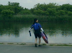 | 天気は快晴。ここのところ週末は快晴が多いので、カヌーを楽しむ我が家には本当に嬉しい限り。 今日は家から車で5分程度の小貝川で、購入して間もないトリックスターとJIBを練習することにした。 ↓ 9:30頃に藤代町総合公園近くの護岸に到着。装備を整えて、カヌーに乗り込みいざ進水。 前回乗ってから2週間が経過していたので、Shoはちょっとドキドキしながら慎重に漕ぎ始めた。 とりあえず下流へ向かって、漕ぎ進み感覚を取り戻していった。 Takaはわりとスイスイと漕いでいったが、Shoは左右のパドリングバランスが悪く時々くるっと一回転しながら進んだ。 ↓ 田んぼへ水を引くために堰を止めてあったので、川の水はほとんど流れが無く濁っていた。 また結構浅いところも多かったりして、パドルが底に着くところもあった。 ↓ 下流へ向かって30分くらい漕いだところで、流れも無いので今度は上流へ向かって漕いでみることにした。 すると我が家が艇を出したところにたくさんの親子連れが集合し、E−BOATに空気を入れていた。 時々ホームページで見ていた小貝川プロジェクトの「土曜学校」だった。 ↓ とりあえず横を通り過ぎて上流へ向かって漕ぎ進んだ。Shoはだんだんと慣れてきて、いつしかガシガシ漕ぐようになっていた。 今までの艇より不安定さはあるものの、体との一体感があるので波で揺れたりするととっても楽しい♪ 調子に乗ってガンガン漕いでいると、JIBが潜水していった。 最初はドキッとして慌てて漕ぐのを止めたShoだったが、沈んだり、浮上したりするのがだんだん楽しくなってきた。 ロールまではまだまだ程遠いが、この艇は漕いでるだけでも凄く面白い。 購入する際にZenさんに「この艇は潜水艦だから・・・」と言われたが、その意味が正直良く分かっていなかった。 でも、今日はまさに体感したっていう感じで。凄い楽しい艇なので、頑張って練習しよう! ↓ Shoの潜水ぶりが羨ましくなったTakaは、トリックスターの先端を沈めてみようと試みる。 すると、“やったぁー、出来たぁ!”これで立つ日も早いかも・・・といつもながら調子にのるのであった。(^_^;) 次回は“ロールの練習だぁ〜!”とのこと。 ↓ 面白くなって漕ぎまくっていると、上空にラジコン飛行機が1機飛んでいた。 かっこ良く飛ばしてるなぁと思っていたら、いきなり上空で小さな翼が1つ取れた。 と思った瞬間、真っ逆さまに対岸の工事現場に落ちていった。あ〜あ・・・。 少しして持ち主と思われる方が、草を掻き分けて私達の近くまで寄ってきた。 「この辺に飛行機落ちませんでしたかぁ?」「対岸に落ちて行きましたよ。」 その後、がっくりと肩を落として立ち去って行かれました。 恐らく崩壊しているような気がするけれど・・・せめて見つかればいいなぁと祈るのでした。 ↓ ちょっとしたハプニングも目撃しつつ、目標としていた白い建物の近くにゴール。 その後、下流へ向かってのんびり漕いでいった。 すると前方から大きなボートが2艇漕ぎ進めてきた。さっき見かけたE−BOATだった。 大きな掛け声をかけながら一生懸命漕いでいる子供達は本当に楽しそうで、微笑ましい光景だった。 だいぶ近くまで辿り着いたところで、カヌーに乗ってサポートをしている男性にご挨拶。 Takaと話をしているうちに、「2人をどっかで見たことあるんだよなぁ・・・。」とのこと。 我が家が参加させて頂いている“多摩川リバーシップ”でのお話をすると、話が繋がったようだった。 その方のお話では、土曜日に時々カヌー教室も開いているとのこと。 機会があったら、我が家も是非参加したいなぁと思うのでした。 ↓ 11:30頃、最初の護岸に到着。本日の練習は無事終了となりました。 今回は“小貝川プロジェクト”の「土曜学校」にも遭遇したりして、賑やかな様子を見られて楽しかった。 川は危ないからと言って子供を近づけないのでは無く、安全な川の楽しみ方を教えてあげるのは本当に良いと思う。 その際に、一歩間違えれば大惨事にも繋がるということをきちんと熟知させれば川の事故も減るのになぁ。 こういう体験教室がもっとたくさんあれば良いのにと、つい数年前まで川の楽しさを知らなかったことを後悔しているShoはつくづく実感するのであった。 願わくば川の良さを色んな人に知ってもらって、カヌー人口も増えるといいなぁ・・・。 この日の午後に小貝川で出会った男性が、我が家のHP掲示板に書き込みしてくれた。 この方のホームページをクリックしてみると、なっ、なんと“Forest”のページの方だった。 実はこのページは以前からちょこちょこチェックさせてもらってましたが、まさかあの方がHPの主だったとはびっくり! 世間は狭い・・・というよりは、カヌー界は本当に狭い。是非今度また小貝川でご一緒させて下さい。宜しくお願いします。 今日もまた新たなお知り合いが出来て、とっても嬉しいTaka&Shoなのでした。 |
