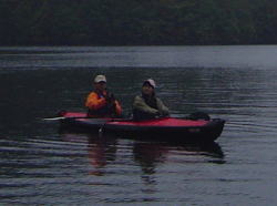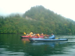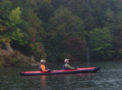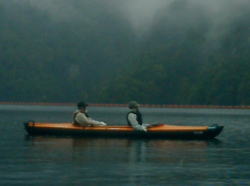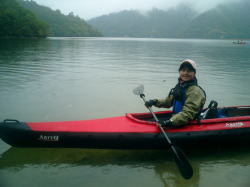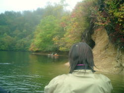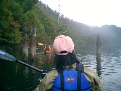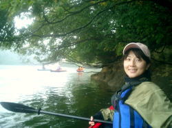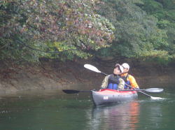 | HIDEさんはゆったり漕ぐのに早い | 木々の下をくぐって行きます | 湖にカヌーが映えます |