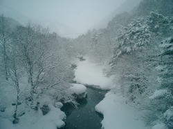 | 暗闇の中、出発! | スキー場前の川 | ゲレンデはがら空き |