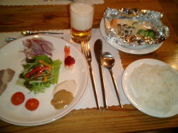 | クイニーアマン&マフィン&ココア | ペンション サンデーファームに到着 | 前菜&鮭のホイル焼き |
