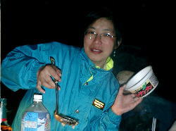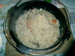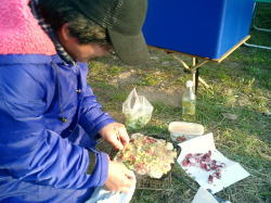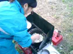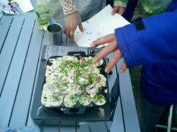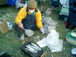 | 虹鱒を丁寧に焼く イノセントスーさん | 皆お料理準備中 | S奥様のパエリア作り |