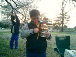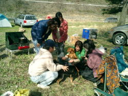 | 春うららかなというか・・・ちょっと暑いくらいの陽気の中、11:30頃自宅を出発。 今回はキャンプ初体験、愛犬ゴエモンも一緒。 Taka&shoは花粉に、ゴエモンは車酔いに襲われながらキャンプ場へ向かった。 ↓ 14:30頃に那珂川沿いの宮原キャンプ場に到着。 とりあえずのメンバーはForeペア+クッキー、Goma御夫妻+アトム、S御夫妻、Jackさん&イノセントスーさん、オタヌキさん、Taka&sho+ゴエモン。 大きな桜の木の下に陣取って、明るいうちから宴会の始まり始まり〜♪ 早朝から参加の釣りチームは昼頃から宴会モードだった模様。 とりあえずのんびりだらだらと飲みながらお喋り。 ↓ 温泉に行くチームは「やまびこの湯」へ。お留守番チームはのんびり、だらだら飲む飲む。 今回、初参加のオタヌキさんはご自慢のランタンお披露目。1955年に作られた貴重なランタンを見せてもらった。 お手入れが行き届いていてピッカピカだった。我が家では絶対管理できない代物だ(^_^;) ↓ お風呂チームが戻ってきたので、各自夕飯の支度にとりかかる。 我が家は今回手抜きで、自宅で作ってきてしまったので、みんなのお料理を見物。 ↓ まずはFore.hさんのたこ焼き作り。自家製の紅しょうがを使うなど、素材へのこだわりはさすがです。 材料を用意して、たこやきプレートに流し込む。 鮮やかにタコ焼きを返していくかと思いきや、使用していた竹串が折れそう。 とっ、すかさずJackさんが車の中から竹串を取り出してきた。さすがに何でも出てくるドラえもんカーだ。 新品の竹串でくるくるときれいに返し、ヤン様たこ焼きの出来上がり〜!とっても美味だった。 ↓ 続いてはJackさんとイノセントスーさんが、早朝に釣った虹鱒を塩焼きしてくれた。 イノセントスーさんはさすがプロ!絶妙な塩加減で、新鮮なお魚だったので本当に美味しかった。 1人1匹、ペロッと食べてしまった。釣りチームの皆様、美味しいお魚をどうもありがとう!! ↓ 続いては我が家の手抜き料理、豚肉とサトイモ+ちょっとジャガイモの煮物。 ↓ 続いてはGoma家のスペインオムレツ。我が家は至って、ごく普通のオムレツしか作れないので、とっても新鮮。 フライパンでなく、ダッチオーブンで焼いたというのもアウトドアならではの発想? 野菜がたっぷり入っていて、さっぱりして美味しかった。 ↓ 続いては、かなり手をかけて作ったオタヌキさんのジャーマンポテト。 調理器具やツーバーナーも珍しい物を使用していた。 勿論お料理もしっかり味付けされていて、とっても美味しかった。 ↓ 続いては、Sho待望のS奥様のパエリア。 実は昨年の夏にS御夫妻とご一緒した際に、「次はパエリア作って下さい!」と話していたのだが、 なかなかご一緒できる機会が無いまま、今日に至ったのであった。そう、S奥様はShoのダッチ友の会会長なのである。 玉ねぎ炒めてシーフードミックスを炒め、米を炒めて、さっと水を注ぐ。そこへコンソメの素を入れる。 出来上がりは芯も無く、ふっくらやわらかでとっても美味しかった。Takaはおかわりまでして頂いてしまった。(^_^;) ごちそうさまでした〜!また次回、ダッチ料理楽しみにしてますね〜! ↓ いろんな種類のお料理を食べて、みんなお腹も大満足。 それぞれ持ち寄った好きなお酒を飲み、笑いあり、ダンス?ありの楽しい宴。 小腹が空いてきたと思ったら、ヤン様がモツ焼きと餃子を作ってくれた。 どんなに飲んでも動きの良いヤン様であった・・・。 ↓ 夜になってかなり冷え込んできたので、焚き火も始めた。 オタヌキさんが珍しいストーブを出してくれた。デザインも素敵で、めちゃくちゃ温まる代物。 しかも上部にはヤカンを置いて、お湯を沸かすことも可能。 ヤン様もTakaもとても欲しくなって感動していたその時。 やっぱりFore語録が炸裂してしまった。「すごいねぇ、スケルトンも置けるんだぁ。」 えっ?!スケルトン・・・? (・_・) 正解はケトル(やかん)でしたー。近いような遠いような・・・。 う〜ん、大切なトピ主様の発言なので、おしいっ!てことにしておこう。 ↓ 夜桜を見ながら満喫していた頃、zenさん、Takuさん、Riverfunさん親子が合流。 ↓ 昼真っから飲んでいたチームは11時過ぎ頃に、睡魔に襲われて就寝することにした。 夜から参加の方々はAM3:00まで飲んでいたらしい。 ↓ 今回は初めて使う2人用のテント。Takaはこっそりエアーベットを用意していた。 5人用に比べたらかなり狭いが、寒い日はこの方が温かくて良かった。 足元に湯たんぽを置いて、Taka&ゴエモン&Shoで川の字になって就寝。 |