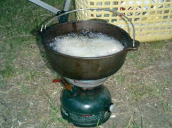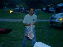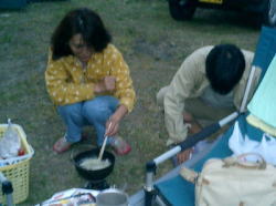 | Goma家の手羽先揚げ調理中 | じっくりと丁寧に揚げるKunkoさん | お隣は“つっぺり隊”のキャンプ |