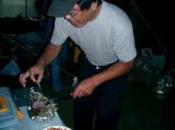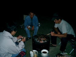 | 焼肉を焼く岩ちゃん | ひとまず全員着席し、 | 改めて、かんぱ〜い!! |