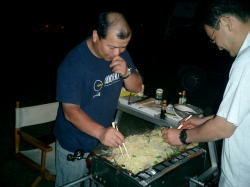 | 塩焼きそばを作る岩ちゃんと助手さん | みんなで混ぜます | クッキーはそろそろおねむの時間 |