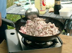 | 堀ご夫妻、微笑ましいですね♪ | 生姜焼き作ってます | 豚肉追加で投入 |