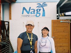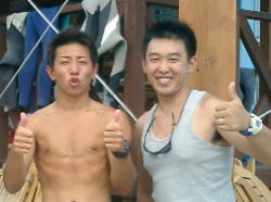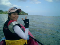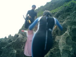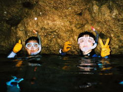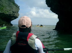 | 9/2(金) AM6:00起床。今日は盛り沢山プランなので、早起きして身支度開始。 AM7:00に朝食バイキングを食べて、AM7:30にホテル出発! ↓ 向かった先は、恩納村にある“マリンクラブ Nagi”。 順調に進んでいたのにカーナビの指示通りに到着したのは、さとうきび畑のど真ん中。 なんで???って思いながら周辺をグルグルしたけど、まったく見つからない。 仕方なく電話して聞いてみたら、カーナビの場所がまったく違うと判明。 AM8:30過ぎにようやく辿り着いたのでした。 ↓ 受付を済ませて、水着の上から分厚いウェットスーツを着て待つ。 今日は晴天の為、ウェットスーツ着てるだけで既に汗がだらだらと流れていた。 今日担当してくれるインストラクターのお兄さんがやって来て自己紹介。 ニックネームは“はんちょ”さん。良い色に日焼けして、無駄肉一切無しの逆三角形。 男のTakaも惚れ惚れするほど、かっこいいお兄さんでした。 ↓ 早速、今日の説明を受ける。午前中はシーカヤック(シットオントップカヤック)とシュノーケル。 宮崎県からやってきた男性4人組(会社の同僚?)と、Taka&Shoの6人で1チームです。 出発前に、Nagiの前で記念撮影。 はんちょさんが「はい、チーズ!」じゃなくて「はい、ゴーヤ!」って言うと、宮崎チームは「ちゃんぷる〜」って返します。 さすが沖縄ならでは!という感じでした。 ↓ 車に乗り込んで、近くの砂浜へ。遠浅のとってもきれいな海でした。 簡単に漕ぎ方の説明を受けて、いざ海へ。シットオントップに乗って漕ぎ出します。 いつもは川か湖で漕いでるので、海の波はとっても新鮮♪ 波に押されながら、のんびり漕いで行きました。岩場の間をくぐり抜けたりするのも、結構楽しい! 時々適度に大きな波が来るので、我が家もカヤック波乗りに挑戦! ザザァーッと波が押し寄せてくるので、慌てて漕ぐ。タイミングを計るのがなかなか難しい。 よしっ!今度こそと意気込んで、必死になって漕ぎまくる。やったぁ〜、波に乗れたぞ〜! うまく乗れると、スーッと気持ち良く進んで行く。海もなかなか良いです。 何回か波乗りに挑戦しながら岸へ辿りついて、シーカヤック終了。 車に乗って、一旦Nagiへ戻りました。 ↓ 少し休憩して、今度はシュノーケルの準備。 好きな色の足ヒレとマスクを選んで、はんちょさんにマスクや足ヒレの付け方説明を聞く。 準備が整ったところで、みんなでてくてく歩いて真栄田岬へ。 真栄田岬に到着。岩伝いに断崖を降りて行く。岩を掴みながら歩いていても、ちょっと恐い。 左にヨロけたら、海へまっ逆さまだなぁと思いながら、はんちょさんの後を着いて行くのでした。 頑張って歩いて行き、洞窟に到着しました。 冷や汗かきかき歩いてきたShoは、洞窟の中の涼しさにホッと癒されるのでした。 ↓ ここは青の洞窟と呼ばれるシュノーケルの人気スポットらしく、たくさんの人がシュノーケルを楽しんでいました。 Nagiチームもシュノーケル支度を整えて、はんちょさんを先頭にみんなで入水して行きます。 Takaは嬉しそうに、泳げないShoはウェットスーツだけで本当に浮くの?という不安を抱えながらの入水となりました。 「あっ、浮いた!良かったぁ。」(Sho心の声) 早速、水面に顔をつけて海の中を観ていくと、魚の大群がウヨウヨ泳いでいました。 洞窟の中に光が差し込んでいる部分は本当に美しいもので、まさに“青の洞窟”でした。 とっ、せっかく楽しんでいたのに、Shoのマスクが雲って何も見えなくなってしまいました(;_;) 入水前に自分の唾液をマスクの内側に擦りつけて曇り止めをしたのだが、ちょっと甘かったらしい。 はんちょさんがささっと曇り止めをし直してくれて、再びマスクを装着! 改めてクリアなマスクで水の中を覗き込みむと「うわぁ〜、すごいきれい!」感動でした。 ↓ 洞窟を抜けていくと、また違った種類の魚達がたくさん泳いでいました。一昨日食べたお刺身の中にいたのかなぁ・・・。 再び洞窟へ戻ろうとしたその時、Shoはうっかり鼻から息を吸って、マスクに溜まってた水を吸い込んでしまった。 慌ててマスクを外して鼻を抑えていると、知らない女の人がスッーと手を差し伸べて、体を支えてくれました。 「大丈夫ですかぁ?」と声をかけてくれて、Shoも一安心。 恐らく他のツアーのインストラクターさんだったと思うけど、本当に助かりました。ありがとうございます。 体制を立て直して洞窟内に戻り、Nagiチームと合流。 はんちょさんが下に魚がいっぱいいるというので、みんなで水中を覗き込みながらプカプカ浮かんでいました。 Shoものんびり楽しんでいると、いきなり両足首を誰かに「ガシッ!」と掴まれました。 きっとTakaがはぐれないように引っ張ってくれたんだろうと思っていたら、今度は大きくバタ足をさせられました。 「あれ〜?なんか変だなぁ」と思って水面に出てみると、宮崎チームのお兄さんがShoの足を掴んでいたことが発覚! どうやらお友達の足と間違えてイタズラしていたようで、みんな