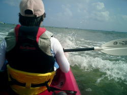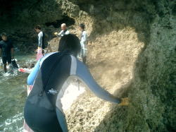 | 初めてのシットオントップに乗って | 大きな岩の間をすり抜けて | 時々波が打ち上げます |