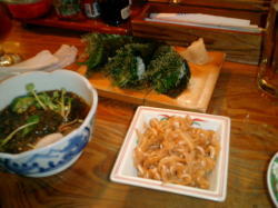 | 名護曲に着きました | モズク酢&海ブドウ巻き&ミミガーキムチ | ゆし豆腐 |