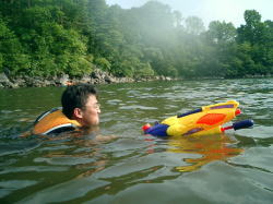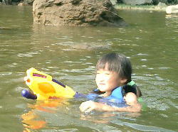 | 大きな水鉄砲で遊ぶMちゃん | Kちゃんは浮き輪で泳いでご機嫌 | 童心に返って水鉄砲で遊ぶSho兄 |