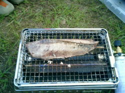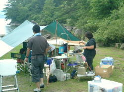 | かつおのたたきを調理中 | 皆で手分けして夕飯作り | 初めてのテントと寝袋です |